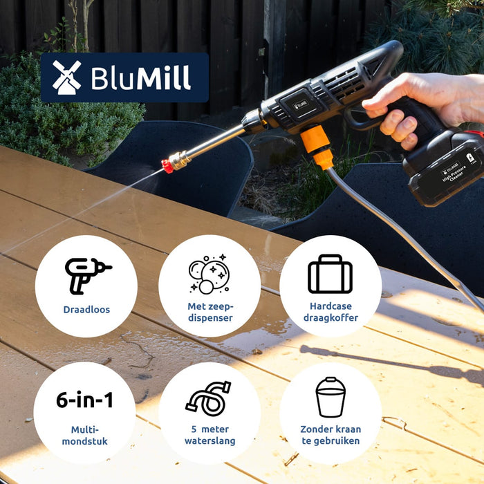 Het verwijderen van hardnekkig vuil, vlekken en stof hoeft niet langer tijdrovend of vermoeiend te zijn. Met de BluMill High Pressure Cleaner wordt schoonmaken een stuk eenvoudiger. Deze krachtige, draadloze hogedrukspuit zorgt voor een grondige schoonmaak bij elke schoonmaakklus!