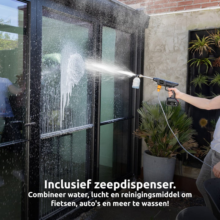 Wilt u er graag wat zeep bij gebruiken? Geen probleem! De meegeleverde zeepdispenser is ideaal voor het wassen van bijvoorbeeld voertuigen en creëert een optimaal schoon resultaat.